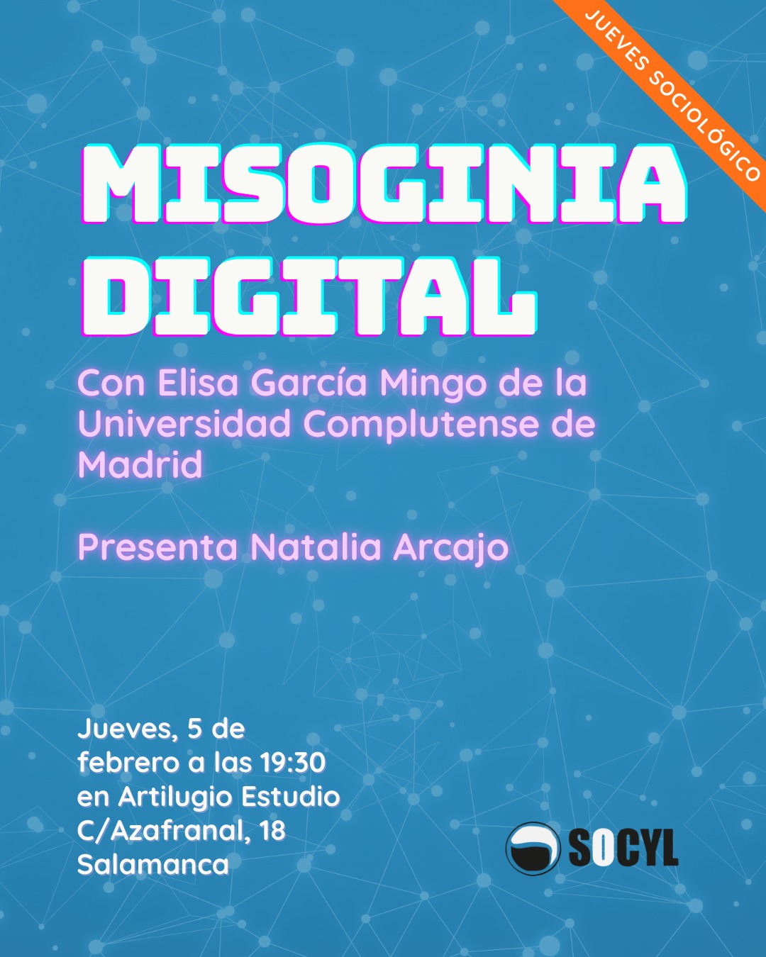 Jueves, 5 de febrero 19:30 h Artilugio Estudio (C/ Azafranal, 18 – Salamanca) De la mano de Elisa García Mingo, profesora de Sociología en la Universidad Complutense de Madrid, nos adentraremos en el análisis de la manosfera española, un conglomerado heterogéneo de espacios digitales que